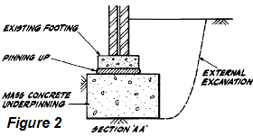 This involves excavating adjoining bays beneath the existing foundation in a sequence, filling the excavations with concrete, and then filling the small gap between the old and new foundation with non-shrinkable material (See Figure 2). The sequence is indicated by the numbers in Figure 1 below.