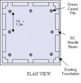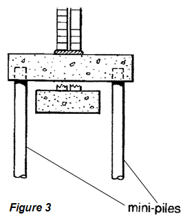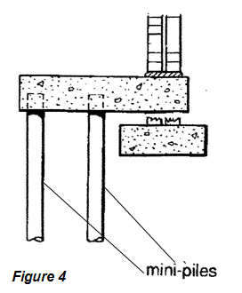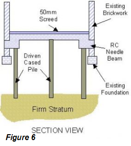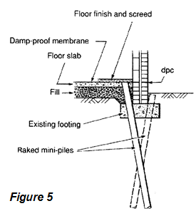 Mini-piles are installed within the property, and a reinforced concrete raft is cast integrally with the piles. Needle beams extend out from the slab into the walls below ground level to support them (See Figure 6).